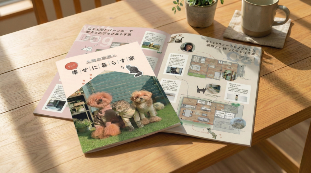 そこで、これから家づくりを始める飼い主様の「興味・関心」や「リアルな悩み」に寄り添い、具体的な暮らしをイメージしてもらうための「ヒント集(パンフレット)を新規制作したい」というご相談をいただきました。