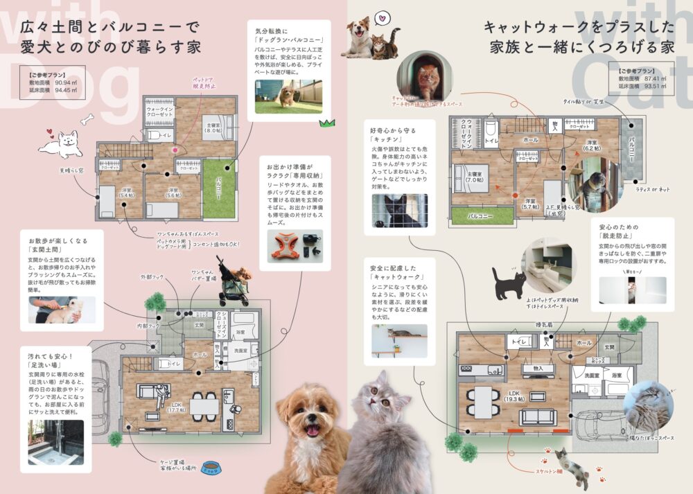 「ペット」と一括りにせず、犬と猫では快適な住環境や動線が全く異なる点に着目しました。 パンフレットの中面(見開き)では、共通の間取り図を使うのではなく、あえて「犬と暮らす間取り」「猫と暮らす間取り」を左右対比で見せる構成をご提案。